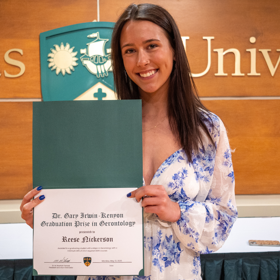 Reese Nickerson, who transferred to STU during her third year to pursue her passion for gerontology, received the Dr. Gary Irwin-Kenyon Graduation Prize in Gerontology.